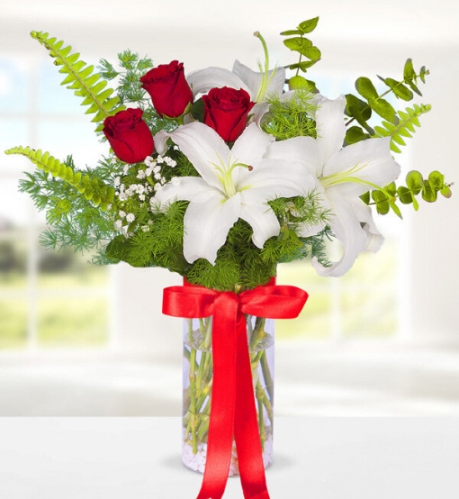 Zarif cam vazoda kırmızı güller ve beyaz lilyumlarla özel olarak tasarlanan çiçek aranjmanı sevdiklerinizin gözlerini kamaştıracak. Not; Lilyumlar, mevsimsel şartlar nedeniyle kapalı olarak gönderilebilir. Kapalı lilyumlar oda sıcaklığında ve 1-2 gün içerisinde açmaktadır.