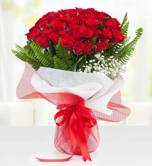 41 Kırmızı Gül Buketi Kırmızı gül, cipsofilya ve çeşitli yeşillikler ile hazırlanmış buket.