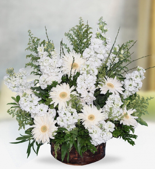 Beyaz Şebboy Gerbera Sepet içerisinde beyaz şebboy ve beyaz gerbera ile hazırlanmıştır.