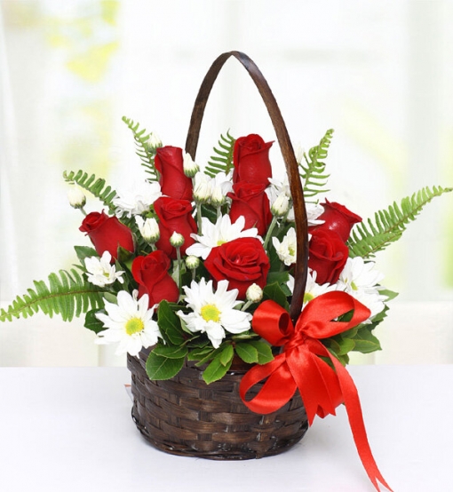Çiçek sepeti içerisinde 9 adet kırmızı gül ve 12 adet beyaz papatya ile hazırlanmıştır. Not; Papatyaların, yapısı gereği aranjmandaki çiçek adedine tomurcukları da dahildir.