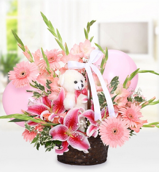 Sepet içerisinde 3 adet pembe lilyum, 5 adet pembe gerbera, 9 adet pembe glayör, 1 adet peluş ayıcık ve 2 adet pembe balon ile hazırlanmış kız bebek doğum aranjmanı. Not; Lilyumlar, mevsimsel şartlar sebebiyle kapalı olarak gönderilebilir. Kapalı lilyumlar ortamına bağlı olarak 1-2 gün içerisinde açabilmektedir.