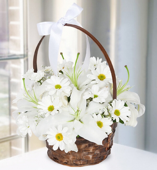 Lilyum Krizantem Sepeti Sepet içinde beyaz lilyum, beyaz krizantem ve yeşillikler ile hazırlanmıştır.