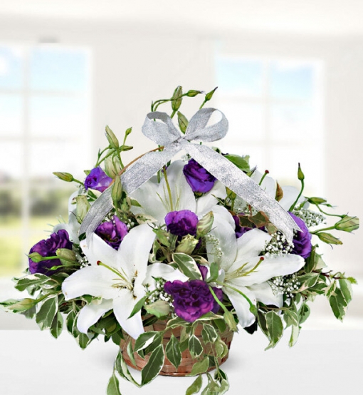 Renklerin dansını sevenler için özenle hazırlanmış, renk skalasının iki güzel ve özel rengi; beyaz ve morun çiçeklerle uyumlu birlikteliğini yansıtan lisyantüsler ve beyaz lilyumlarla hazırlanmış sepet içerisinde hayır denilmesi zor, şık orta boy aranjman. Not; Lilyumlar, mevsimsel şartlar nedeniyle kapalı olarak gönderilebilir. Kapalı lilyumlar oda sıcaklığında ve 1-2 gün içerisinde açmaktadır. Lisyantusların yapısı gereği, aranjmandaki çiçek adedine tomurcuklar da dahildir.