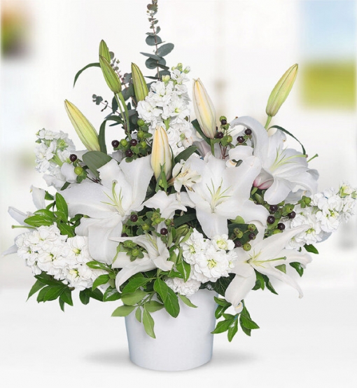 5 Adet beyaz lilyum, 5 adet beyaz şebboy ve yeşillikler ile seramik vazoda hazırlanmıştır. Not; Lilyumlar, mevsimsel şartlar sebebiyle kapalı olarak gönderilebilir. Kapalı lilyumlar ortamına bağlı olarak 1-2 gün içerisinde açabilmektedir.