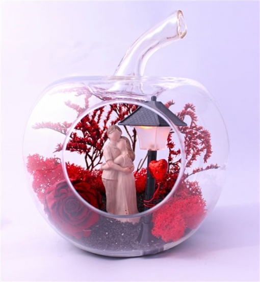 Küçük elma fanus içerisinde 1 adet solmayan gül, kurutulmuş gerçek bitkiler ile şoklanmış yosun kullanılmıştır. Tasarımda 1 sarılan sevgili objesi, 1 adet ışık figürü ve 1 adet simli kalp figürü bulunmaktadır. Bakıma ihtiyaç duymayan solmayan güllerin size uzun bir ömürle eşlik etmesi için (max.3 yıl) su ve güneş ile direkt temas etmemesi yeterlidir. Not: Kullanılan cam, üfleme cam olduğu için, her bir cam kendine özeldir ve farklılıklar gözlenebilir. Ürünün yapımı esnasında sap kısmının kesim noktası eğimli bir görüntüye sahiptir, kırık değildir. Fanus boyutu 19 cm x 22 cm'dir.