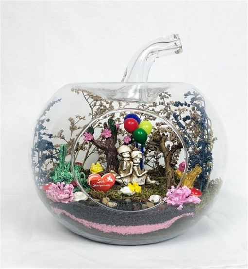 Orta boy elma fanus içine uygulanan bu tasarımımız tamamen kurutulmuş bitkilerle dekore edilmiştir. Teraryum içerisinde kullanılan objeler; 1 adet sırt sırta sevgili,balon, 1 adet ağaç, 1 adet baykuş,1adet bless kuşlu 1adet yapay kaktüs 2 adet mini mantar figüründen oluşmaktadır. Canlı bitki olmadığı için bakıma ihtiyaç duymaz. İç mekan için uygundur. Işık almayan daireler, ofis alanları için ideal bir üründür. Elma fanus boyutu 19 cm x 22 cm'dir. Not: Kullanılan cam, üfleme cam olduğu için, her bir cam kendine özeldir ve farklılıklar gözlenebilir. Ürünün yapımı esnasında sap kısmının kesim noktası eğimli bir görüntüye sahiptir, kırık değildir.